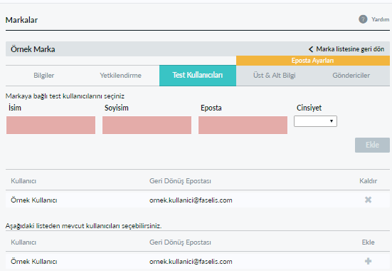 Test kullanıcılarını altta yer alan aktif kullanıcılardan seçebileceğiniz gibi isim, soyisim, eposta ve cinsiyet bilgilerini doldurarak da tanımlayabilirsiniz.
