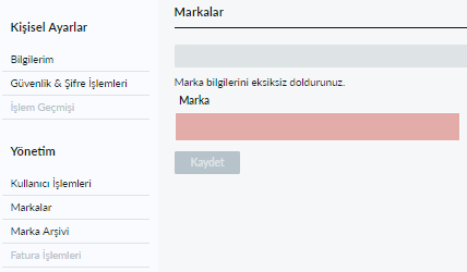Yeni marka tanımlamak için sağ üst tarafta yer alan “Yeni Marka” yazısına tıklamanız gerekmekte. Kurum kullanıcılarının yeni marka açma yetkisi olmadığı için Kurum kullanıcılarında “Yeni Marka” yazısı gözükmez. “Yeni Marka” yazısı üzerine tıkladığınızda marka bilgisini girebileceğiniz boş bir sayfa gelir.