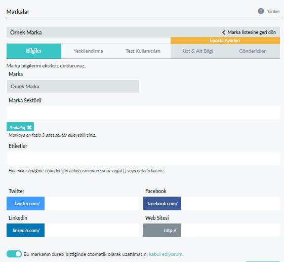 Alt kısımlarda yer alan markanın web adresi ve sosyal medya hesap adreslerini de ekleyebilirsiniz. Eğer markanın kullanım süresinin her ay otomatik olarak uzamasını istemiyorsanız ön tanımlı olarak açık gelen alttaki anahtarın üzerine tıklayarak otomatik süre uzatma özelliğini kapatabilirsiniz.
